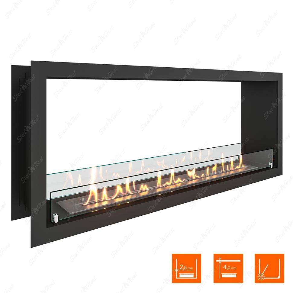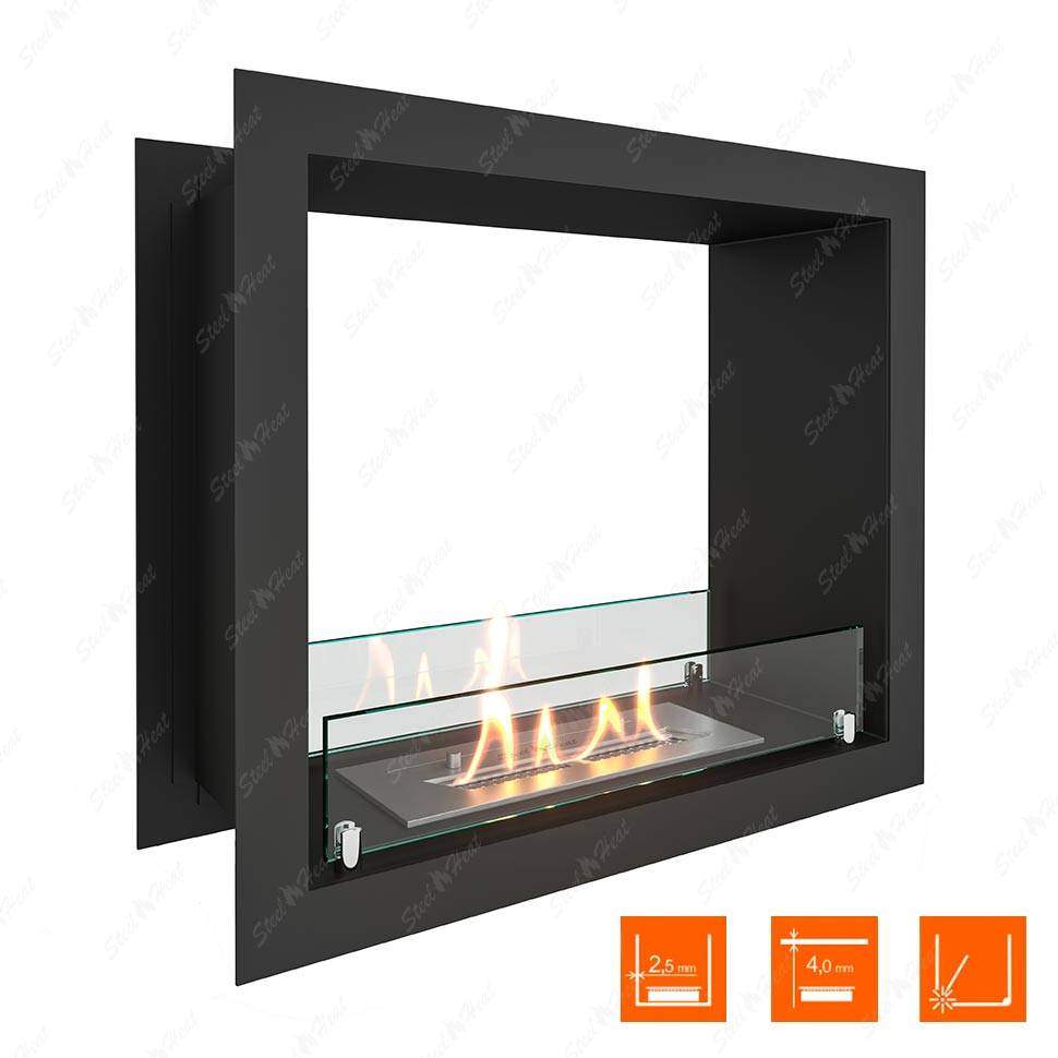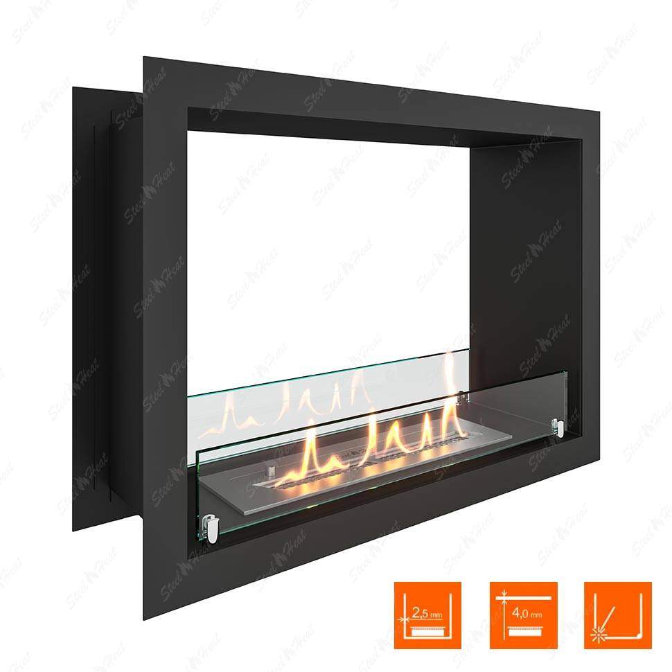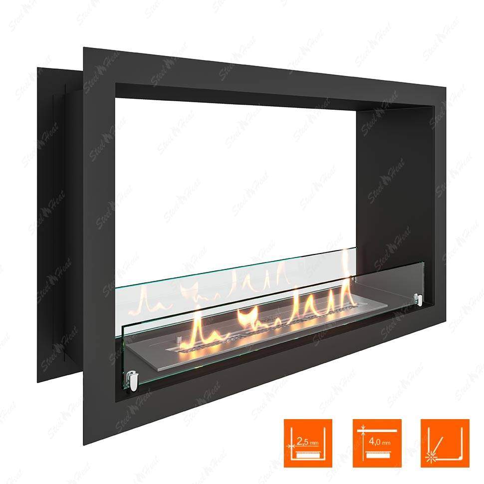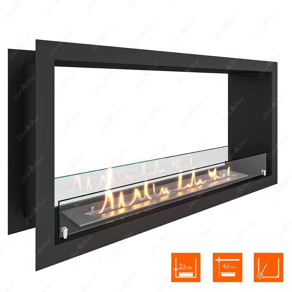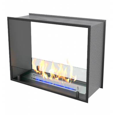 В основную комплектацию сквозного биокамина входят крепкий каркас и бак для топлива. Корпус создаётся из огнеустойчивых материалов, которыми обычно служат металлические сплавы. Именно по корпусу измеряются масштабы ниши в стене, чтобы он поместился без проблем. Стандартная глубина проёма для закрепления на стене — около 15-20 см. Доступ к огню ограничен защитным экраном из стекла.Сквозной биокамин предпочитают благодаря отсутствию дымохода и дополнительных коммуникаций и инженерных сетей. Это упрощает монтаж в несколько раз. Прибор работает исключительно на экологичном биотопливе, поэтому беспокоиться о дыме, копоти или грязи не стоит. Время горения зависит от размеров бака с топливом. Также от него зависит и уровень пламени. Как правило, длительность горения составляет от четырёх до шести часов. Регулировать интенсивность можно самостоятельно, многие приборы предусматривают индивидуальные настройки. Специальные датчики не позволяют гореть сильнее, чем необходимо, и отвечают за безопасность системы.